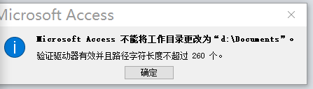 Microsoft Access不能将工作目录更改为“d:\Documents”。验证驱动器有效并且路径字符长度不超过260个。的解决方法