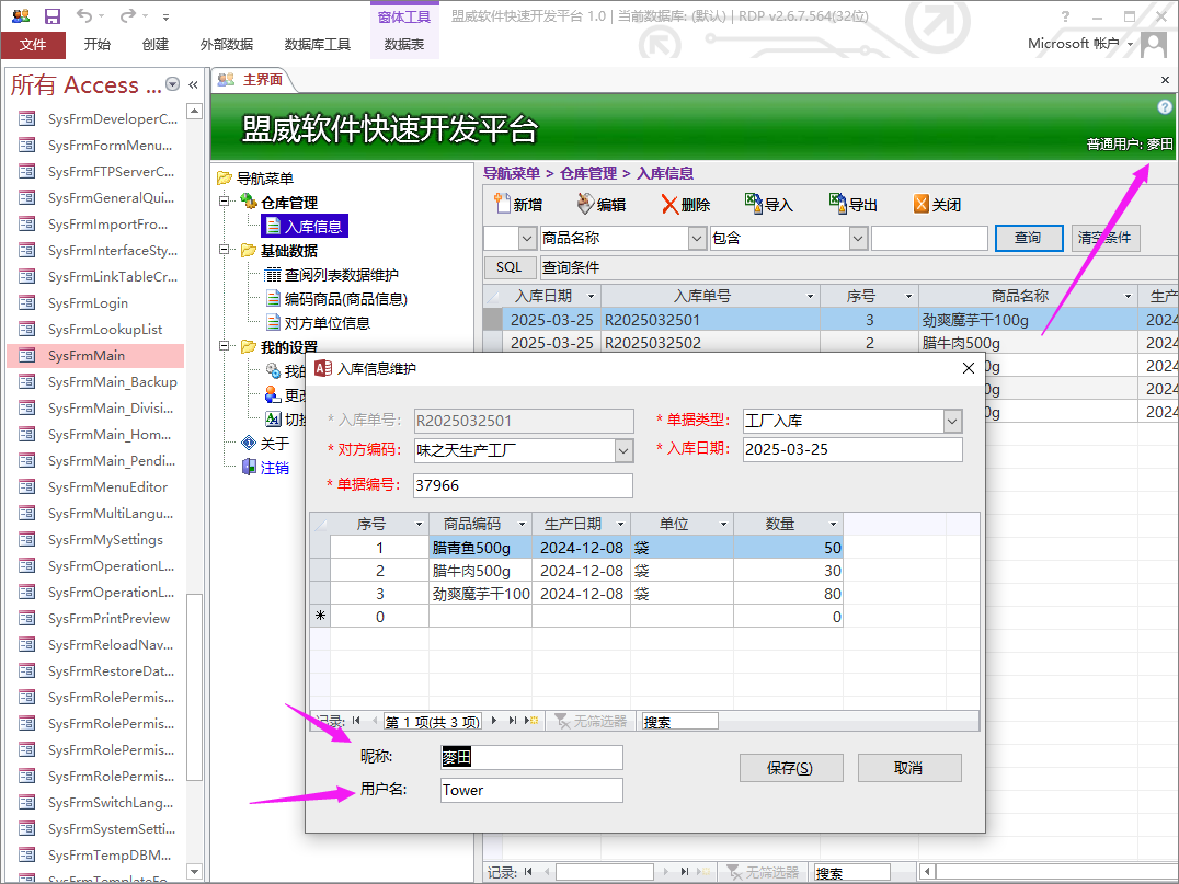 Access快速开发平台2.6.7版本获取当前用户名用: