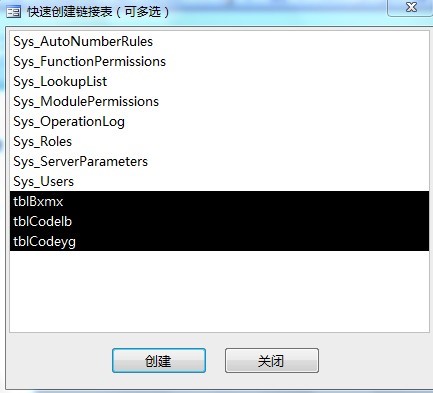 在这个【链接表】对话框中,已经列出了【Data.mdb】数据库中所有的可供链接的用户表(对于Access系统而言,《盟威软件快速开发平台》所用的系统表也属于用户表,但对于《盟威软件快速开发平台》的用户而言,这部分Sys_开头的表属于平台系统表,在没有正确指导的情况下,严禁用户直接修改和删除),接下来,向下拉动垂直滚动条,然后,按住键盘上的Ctrl键(与按住Shift键一样,中途不能松开),依次点选tblBxmx、tblCodelb、blCodeyg,如下图所示: