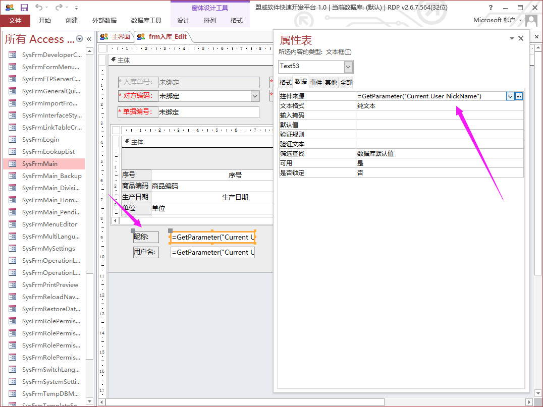 Access快速开发平台2.6.7版本获取当前用户名用: