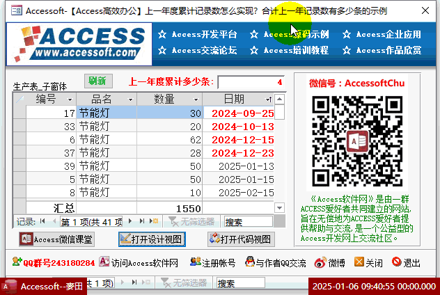 【Access高效办公】上一年度累计记录数怎么实现?合计上一年记录数有多少条的示例,汇总上个年度数据个数,总计前一年数量记录数,access数据库如何合计汇总过去一年数据有多少条?统计之前1年的数据记录个数
