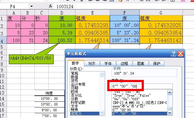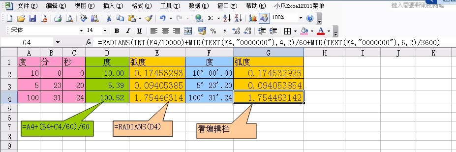 =RADIANS(INT(F4/10000)+MID(TEXT(F4,"0000000"),4,2)/60+MID(TEXT(F4,"0000000"),6,2)/3600)