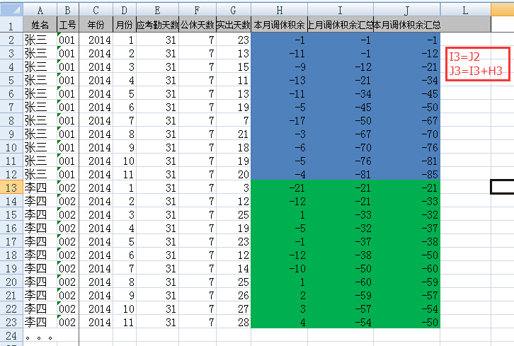 1、 每个“工号”从1月开始一直到最后一个月分别进行逐月“上月调休积余汇总”及“本月调休积余汇总”的计算,其中,当“月份”为1时,“上月调休积余汇总”及“本月调休积余汇总”等于“本月调休积余”。如当1月时,I2=H2 J2=H2