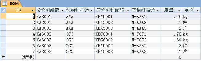 父物料编码 XA3001 父物料描述 AAA