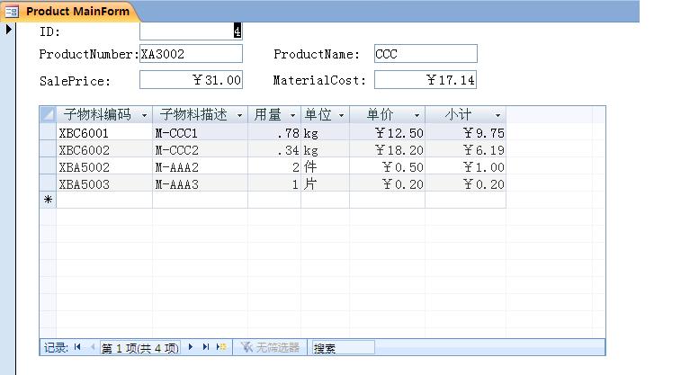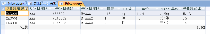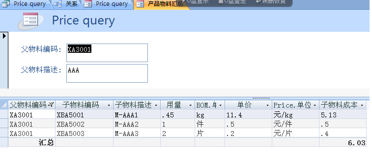 希望统计父物料下的所有子物料的价格之和,并在窗体中改变父物料,子窗口中可将所有子物料显示出来,效果示意如下,请给予帮助。