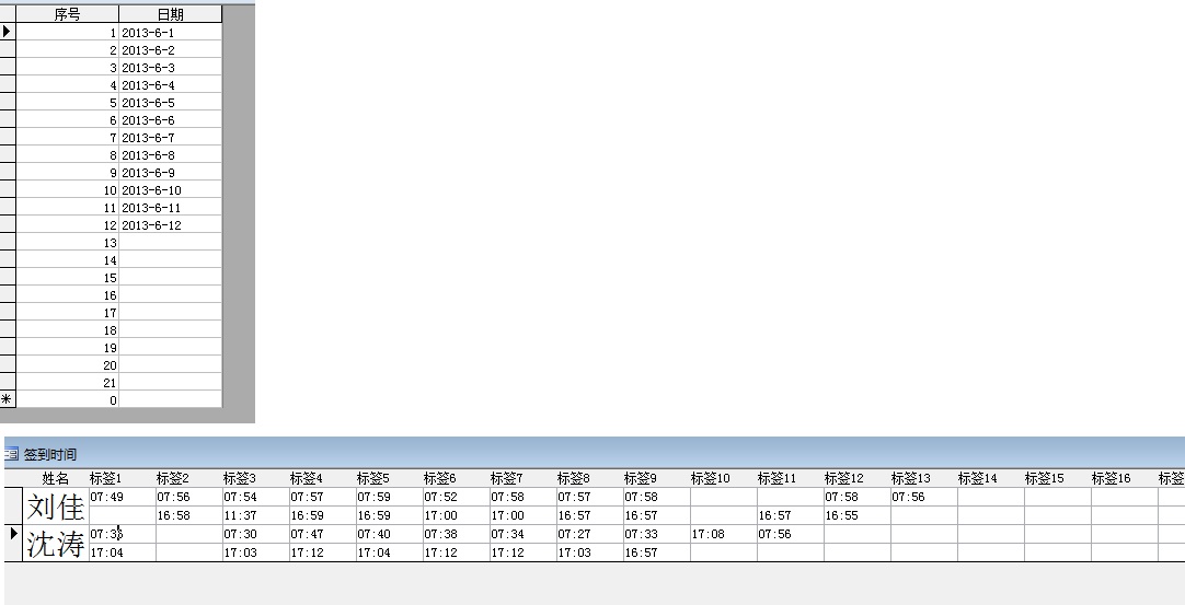 1,建立一个中间表专门用来储存交叉表的列标题。可以参考我以前的文章http://www.accessoft.com/article-show.asp?id=8451。这样在子窗体里面就可以使用固定的字段名了,注意!我的实例里面没有对整个临时的表进行任何处理。只有把我文章的思路复制过来才有用的。用这个临时表有个好处。就是即使当天没有任何人员签到跟签退。都会显示为空。