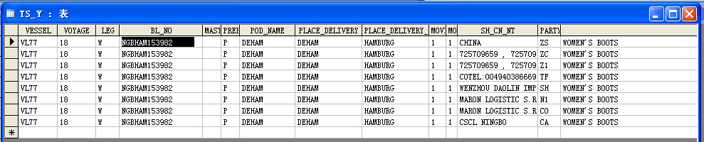 还是不太明白,在你的表中BL_NO字段的值,与CARGO_DESCRIPTION_FIELD字段的值是对应的,以BL_NO字段的值“NGBHAM153982”为例,其对应值是“WOMEN'S BOOTS”。见下表: