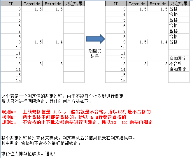 2.给你一个建议:把未被抽检测定值一律设为1.0,就可以自动生成“合格”,然后利用不合格ID查询上下组ID,然后判断为“追加测定”,这样简单多了