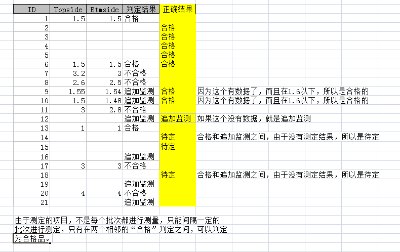 1. 假设测定ID9合格而ID10不合格,那么ID9是显示“合格”还是“追加测定”呢?还是说肯定不会遇到连续抽检的情况?