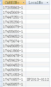 问题2:几百条CARESNo,显示了,但大部分没有对应的LocalNo,而人工检查发现,基本所有的CARESNo,其实都是有对应的LocalNo。FU Tracking这张表中的CARESNo是有重复值的,而Tracking这张中的CARESNo是唯一的。问题会不会出在这儿?