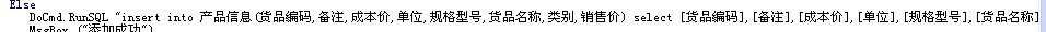 insert into语句中的 ...select [货品编码]... 这段改为 ...select nz(货品编码,'')...  其他以此类推,把所有文本型的[字段名]都改为nz(字段名,''),数字型的[字段名]都改为nz(字段名,0)试试。