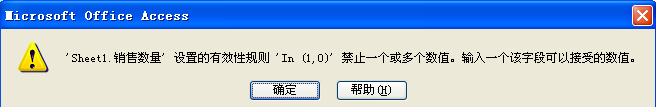 主键你已经设置好,无需再改。只要将销售数量字段下方常规选项卡-有效性规则属性:In(1,0) 就可以了。
