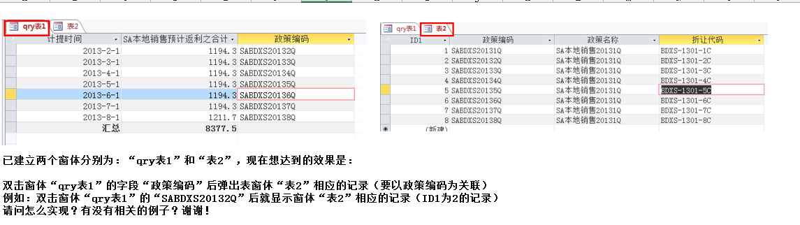 Me.RecordSource = "select * from 表2 where 政策编码 ='" & Form_qry表1!政策编码 & "'"