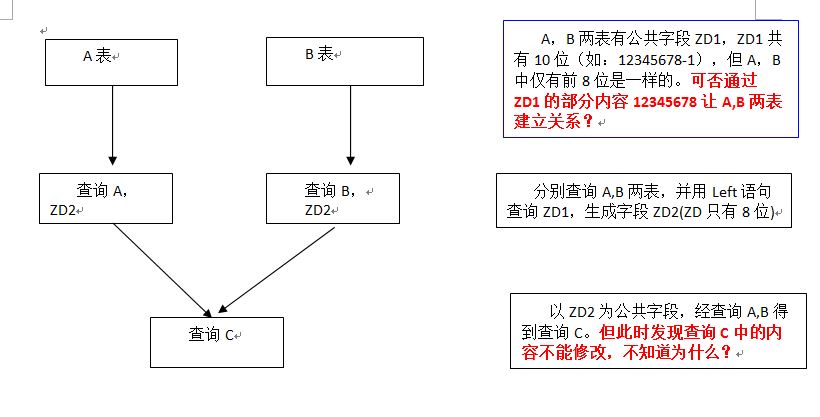 谢谢 dbaseIIIer ,我理解下,就是在我更新 A B两表时,就更新出新的字段ZD2, 这样A,B 两表中就有ZD2了,然后就可以查询A, B两表,得到我要的结果。
