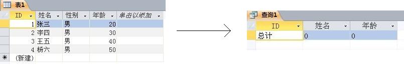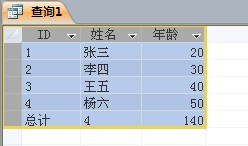 这个是 性别为"男"的查询结果,即共 4人,年龄总计 为140 (姓名是count 计数,年龄是SUM求和),问题是条件为 "女",姓名可以计数,但是年龄 总计结果 为空值。