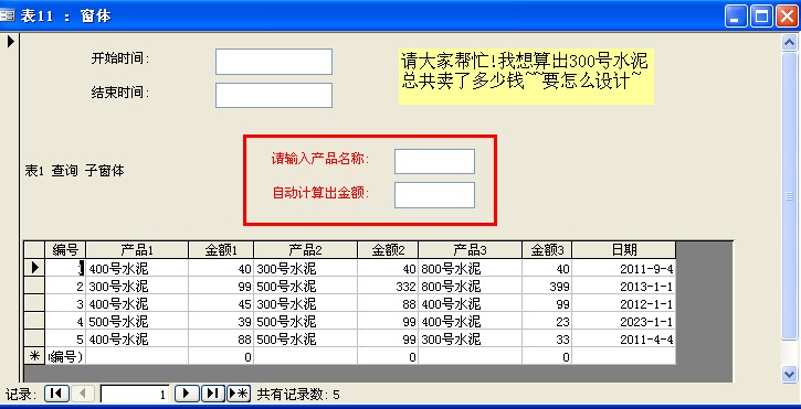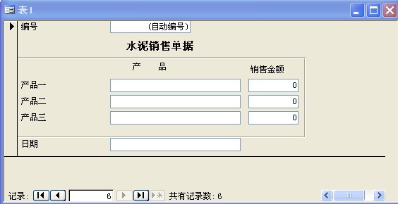 我弄了一个水泥销售单, 为了打印方便, 我在窗体 表1中, 将产品设成 产品1,产品2,产品3 ,金额设成金额1,金额2,金额3 ,分别对应着6个位置(控件). 如图