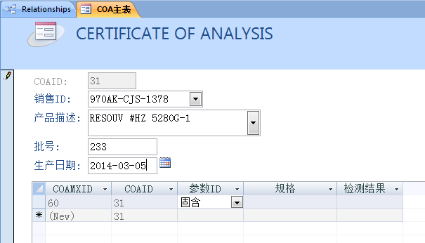 检测明细表.coaid)=[coaid] and (COA检测明细表.参数ID)=[参数ID]);