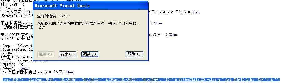 本意是想取出“出入库表”中,距离最近一次入库物料的单价,可是运行时报错。“出入库ID”为自动编号