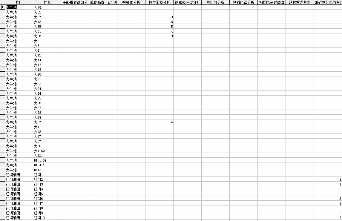 我想在下面这个表的基础上,建立一个查询,输入井名,查询对应该井名,记录不为空值的字段的字段名,这样我可以利用查询出来的字段名,调用对应与该字段名名字一致的表,实现一个纵向有一定深度的查询。