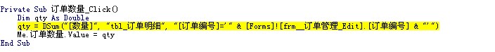 dsum("[数量]","订单明细","[订单编号]='" & me.订单编号 & "'")