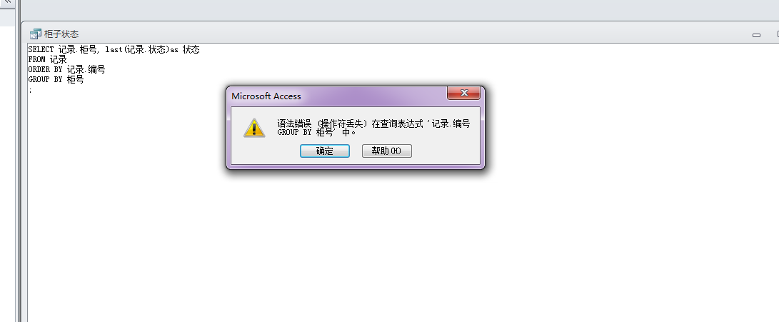本来是在access2003中做的出现同样的错误,本来以为数据库的问题。但是现在换成2010的还是提示同样的错误。如order by 不能直接输入。只能在设计视图添加,下面的group by 也是我自己输入的提示语法错误