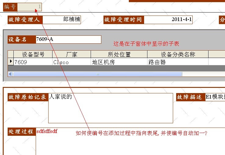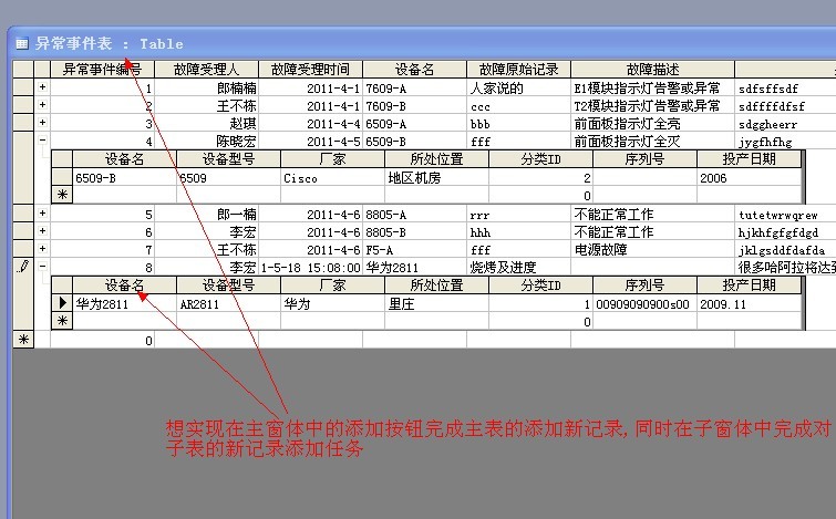 下面是主窗体中添加按钮的代码,当然这里有不少问题,但现在主要关心的是如何实现主窗体与子窗体的主与从表中都能添加新的记录等待录入信息?
