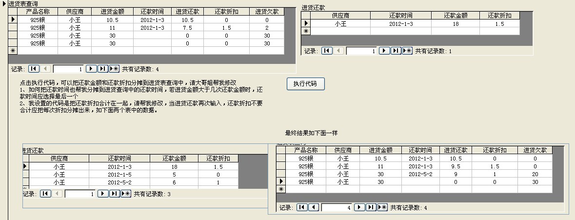 打开记录集,写上条件语句,如果欠款不为0以及还款额大于欠款额,全部还完,剩余款movenext 还,直到剩余额为0。