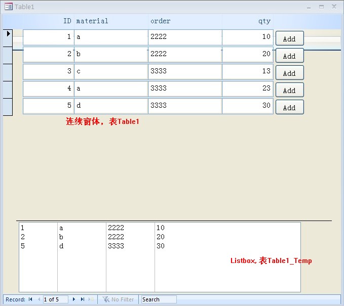 选中ID 为1,3,5增加到listbox(表为Table1_temp包括ID为1,3,5记录)中,则连续窗体中1,3,5行颜色发生变化。