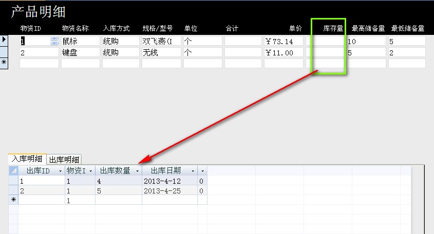 我做了一个办公用品管理系统,界面很简介,主窗体是库存状态,子窗体是入库和出库组成,现在要计算库存量=入库总和-出库总和,遇到技术瓶颈了,还请大仙们帮忙解决哈,急!!!!点击下载此附件