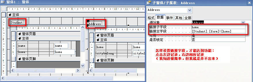 兄弟关系要做到“点击左边子窗体student的一条记录时,子窗体address能找到对应字段home的记录”就得用代码处理