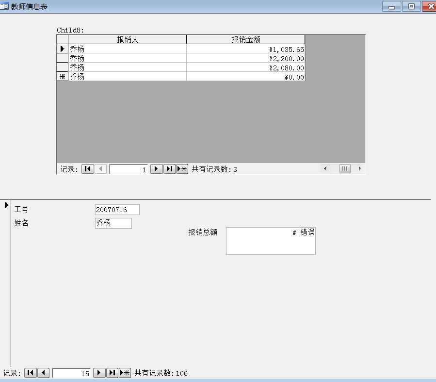 我设计了一个经费报销的程序,每一个人的报销明细以子窗体(采用数据表视图)的形式显示,我想在主窗体中添加一个文本框显示该人的报销总金额,请问该如何设计。我在文本框的数据来源中写如下代码=Sum(Forms!教师信息表!child8!报销金额),运行时报错。请高手帮帮忙,很困惑!程序见下图: