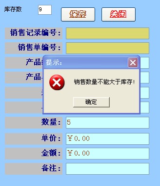 MsgBox "销售数量不能大于库存!", vbCritical, "提示:"