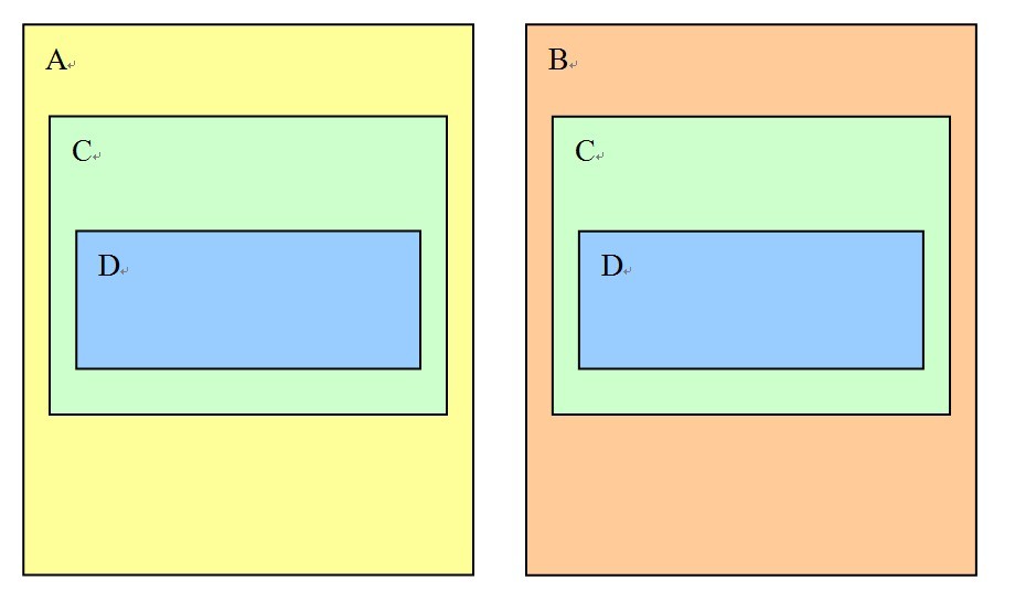 A、B窗体中都包含C窗体,C窗体中还包含了D窗体。