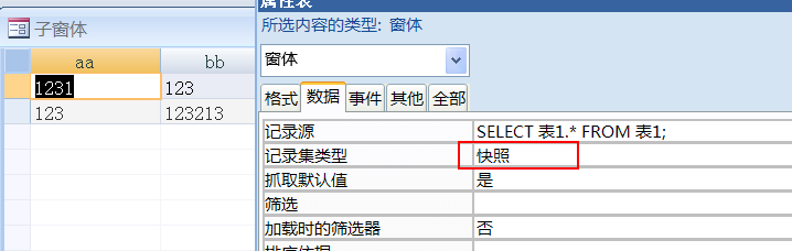 你的子窗体控件未绑定任何对象。无法使用 Me.子窗体.Form.RecordSource = "select * from 表1"