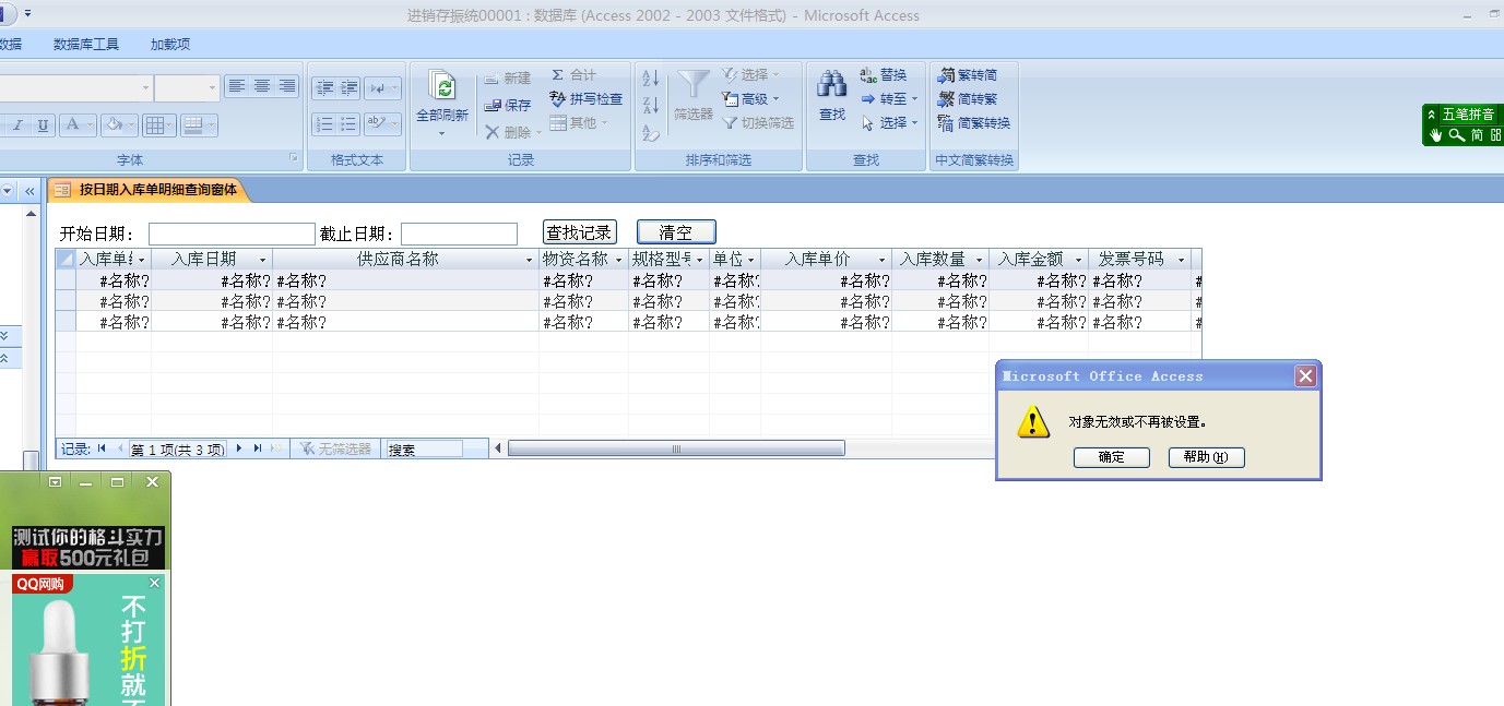 各位高手:我在建立按日期入库单明细查询窗体时出现错误,不知怎样解决?请帮忙。