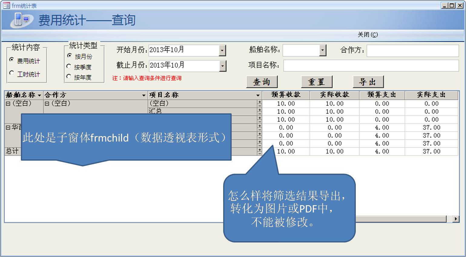 利用控件设置条件筛选子窗体的结果,子窗体为数据透视表和数据透视图。现在想怎么样能把子窗体的结果转化为图片或PDF文本呢?