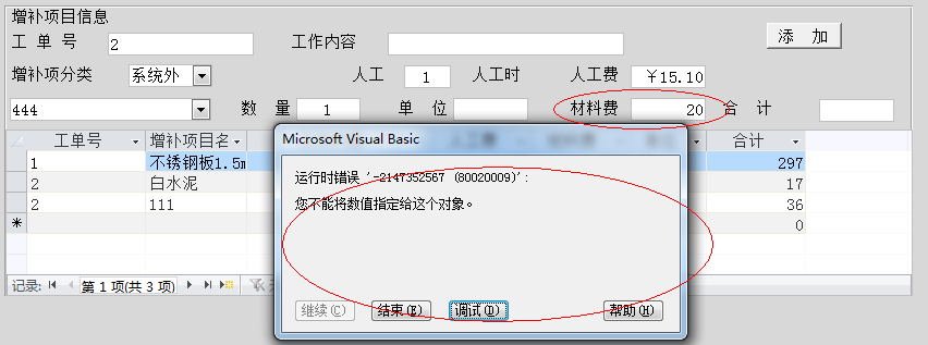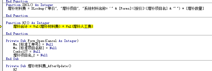 错误那一行为什么把 me 去掉了呢?  Me.增补合计 = Val(Me.增补材料费) + Val(Me.增补人工费)