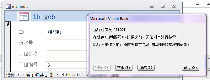 在access中,表中如果有一个字段ID是自动编号,只要其他任意字段有插入动作(还未保存),自动编号字段ID就马上生成了,这时如果采用绑定表录入窗体,我直接在"流水号"字段里面引用自动编号字段ID, 用vb语句如下: