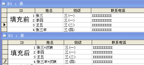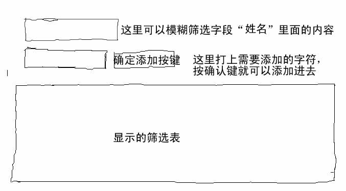 本人想设计一个这样的窗体(图1),数据表(图2)通过模糊筛选“姓名”里面的内容。可以将比如李三和李三丰都可以显示出来,然后窗体下面再打下汉族,点确认后。形成(图2)下面的那样。有姓名后面自动加上“+汉族”字符。