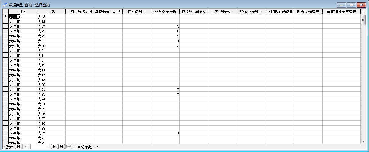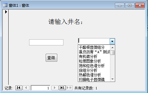 我想根据第一个图中的表,创建第二个图中的窗体,要求是在窗体的文本框中,输入表中的井名,然后后面的组合框中会进行一个筛选,保留表中对应的井名行记录中,有数据(不为空)的字段名,其他的隐藏,这个筛选要文本框输入后直接进行,不是依靠下面的查选按钮(按钮是为了以后的其他功能,这里先不考虑)这个组合框该如何设置呢??