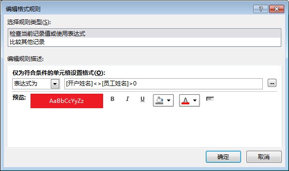 我想达到的目标是,如果开户名称与员工名称不同并且不为空的时候,显示为红底白字