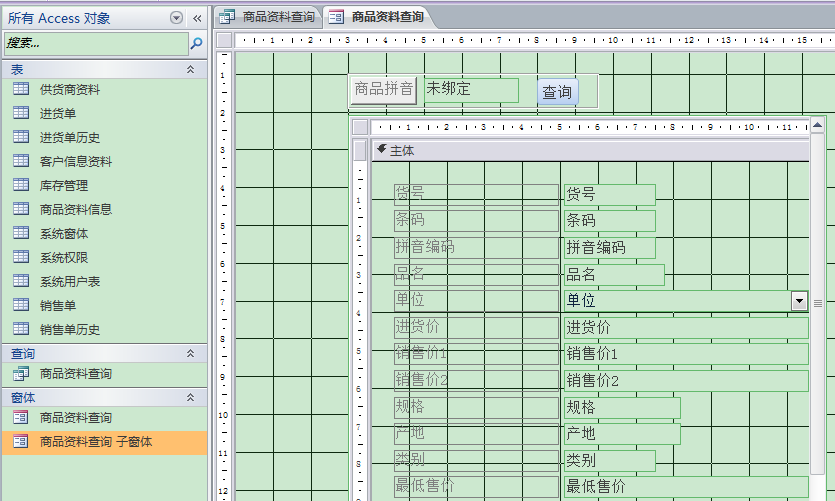 WHERE (((商品资料信息.拼音编码)=Forms![商品资料查询]!TxtpinC)) Or (((Forms!商品资料信息!TxtPinC) Is Null))