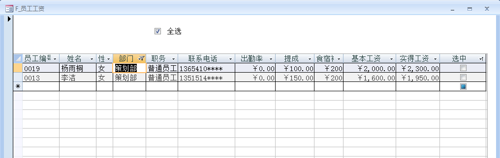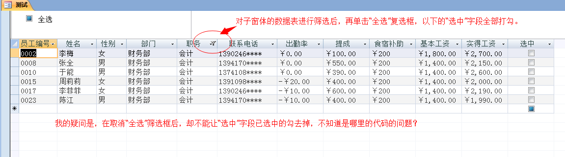 请教高人,我想实现下图中,在数据表窗体对部门进行了筛选后,再单击复选框全选,筛选后的记录的选中字段都被选中,值为-1。点击下载此附件