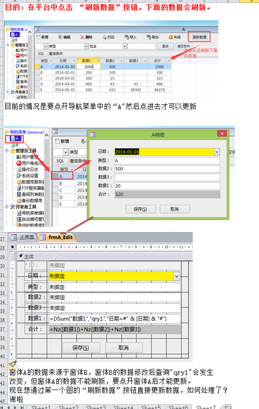 因为 窗体A是要取查询“qry1" 的数据,而qry1 本是联合查询,我举例时简化了,所以不能在窗体B中修改,请各位大师帮忙做一个(在第一个图的刷新按钮操作),谢谢!