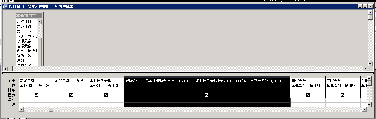 我按照你的公式改了一下,在“全勤奖”控件中写入=IIf([本月出勤天数]=26,260,IIf([本月出勤天数]=25,130,IIf([本月出勤天数]<=24,0)))可以计算,但是在查询里确出错。不知道为什么。还请煮江品茶 指教。