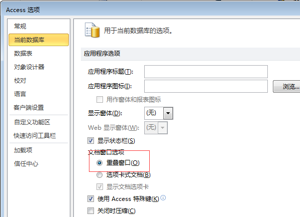 试试:文件--->选项--->当前数据库--->选择  重叠窗口