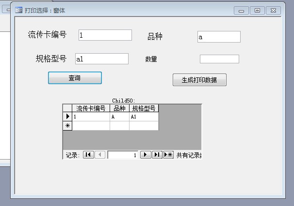 附件中打印选择窗体有四个文本框 其中 流传卡编号 品种 规格为查询条件, 只有输入流传卡录入表中对应的字段值后点击“查询”按钮才可以在子窗体中显示出内容以便核实,核实无误后点击“生成打印数据”按钮将通过生成表查询生成一个新表名为“打印数据”而文本框“数量”中输入的数字讲成为“打印数据”表中实打数量的字段。经测试以上功能正常但是有一个问题在设计视图打开“打印数据”表会看到实打数量字段的数据类型为二进制而且不允许改变,这个字段值下一步要控制打印机只能为数字,请教各位高手问题在哪怎么改。最好在不增加按钮及其他窗口的原则下改的谢谢啦!