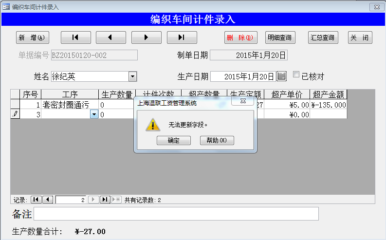请问我在子窗体中第一次选择一个工序后,出现无法更新字段,但是按确定后及第二次选择却正常,不知道什么原因。