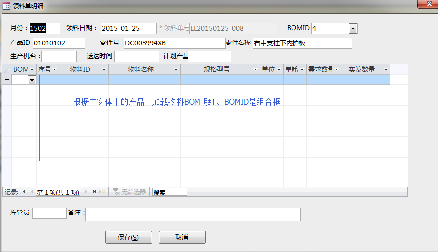 主窗体中有个BOMID组合框,我希望在输入产品方面的信息后,子窗体自动加载对应产品的物料消耗BOM明细。