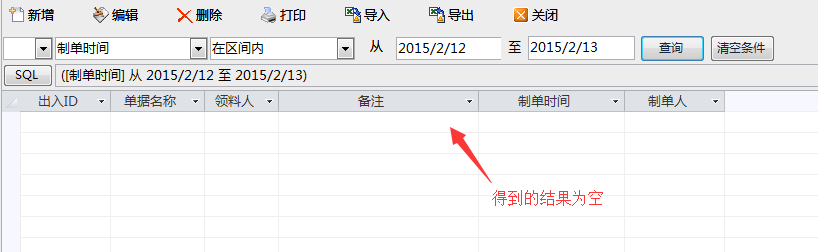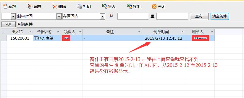 2015/2/13 12:45:12 是介于 2015/2/13 和2015/2/14之间的,所以你就算用区间,那也应该是从 2015/2/13 到 2015/2/14才对。用 2015/2/12 到 2015/2/14 的区间当然不可能查得出来。
